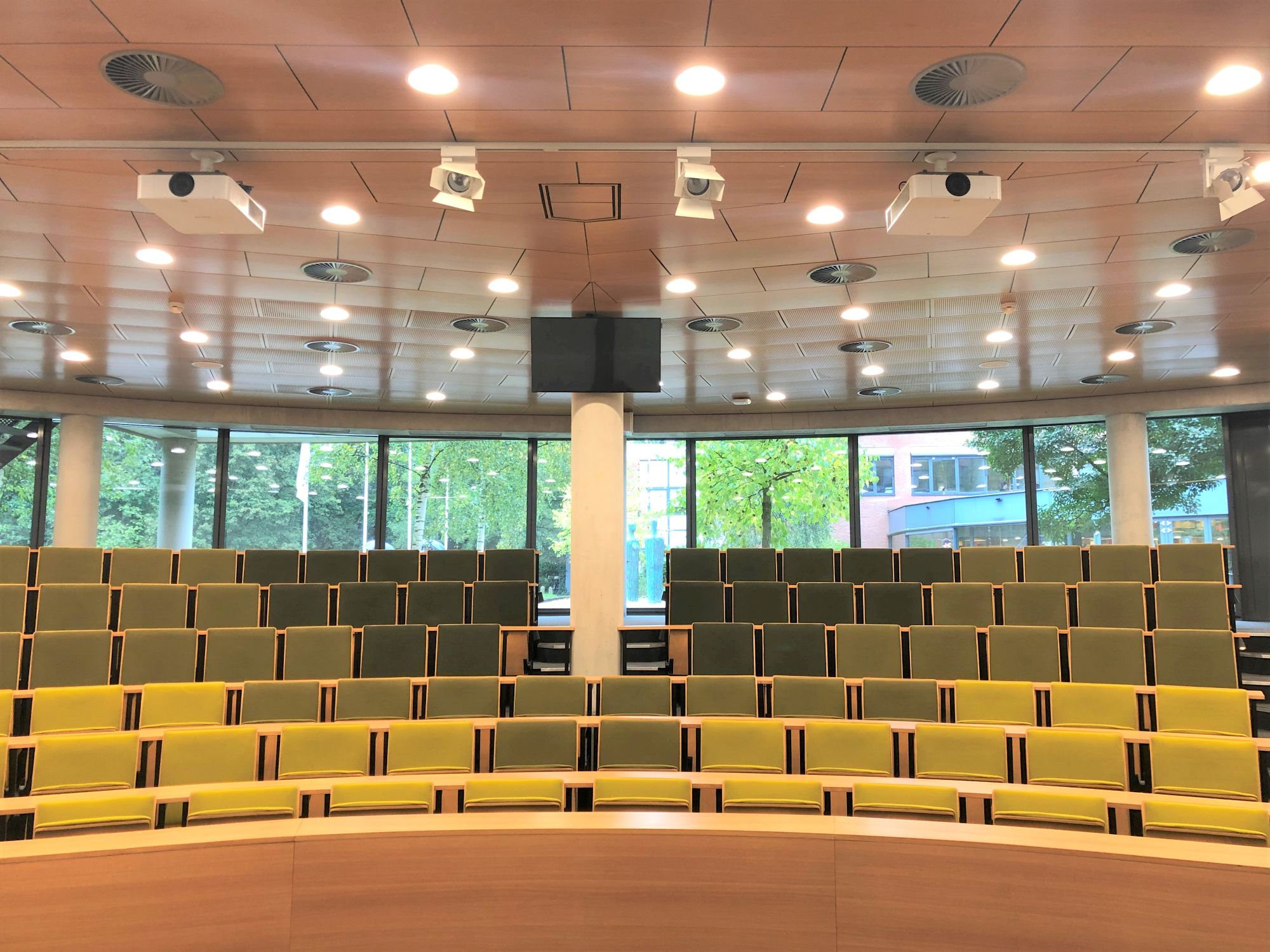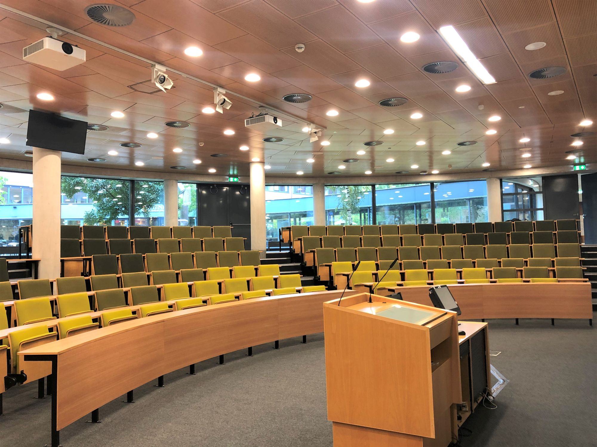 Uitgerust met een projector heeft het auditorium hybride functionaliteit (Mogelijkheid voor het toevoegen van online deelnemers aan de sessie) Hier is het mogelijk om via de aanwezige HDMI-kabel en aanwezige verloopjes een eigen laptop aan te sluiten. Er is Wifi aanwezig en er is de mogelijkheid om de sessie te laten opstarten door het AV-support team. Deze zaal is uitgerust met standaard 3 revers microfoons en 1 handheld microfoon.