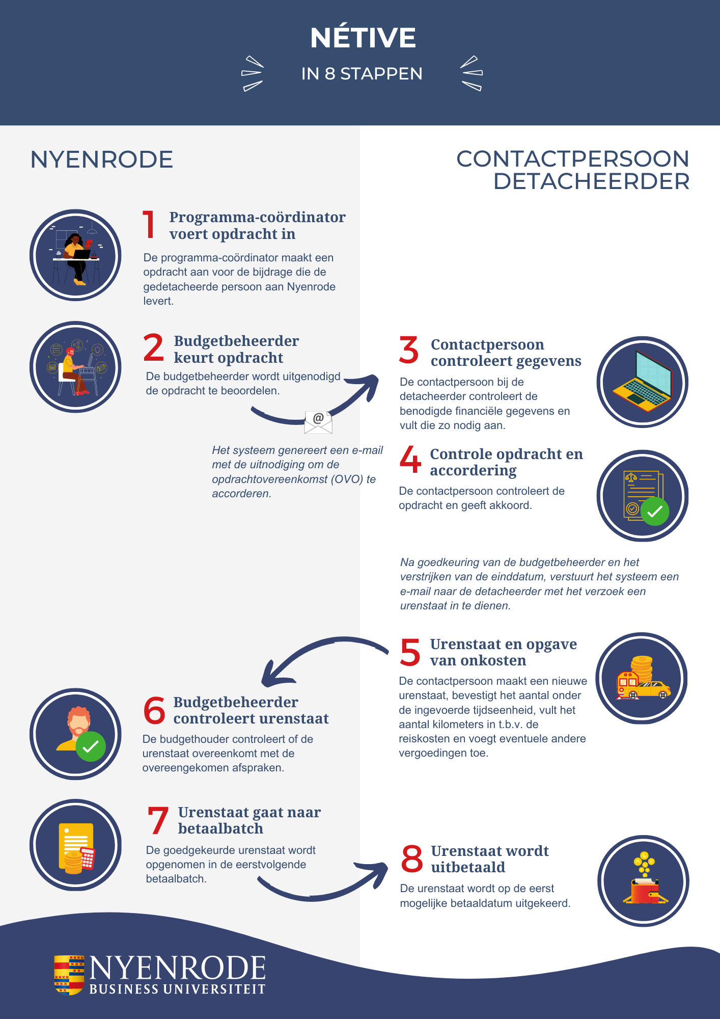 De handleidingen zijn per processtap uitgewerkt. Voor vragen kun je altijd contact opnemen met netiveservicedesk@nyenrode.nl of met jouw eigen contactpersoon binnen Nyenrode.