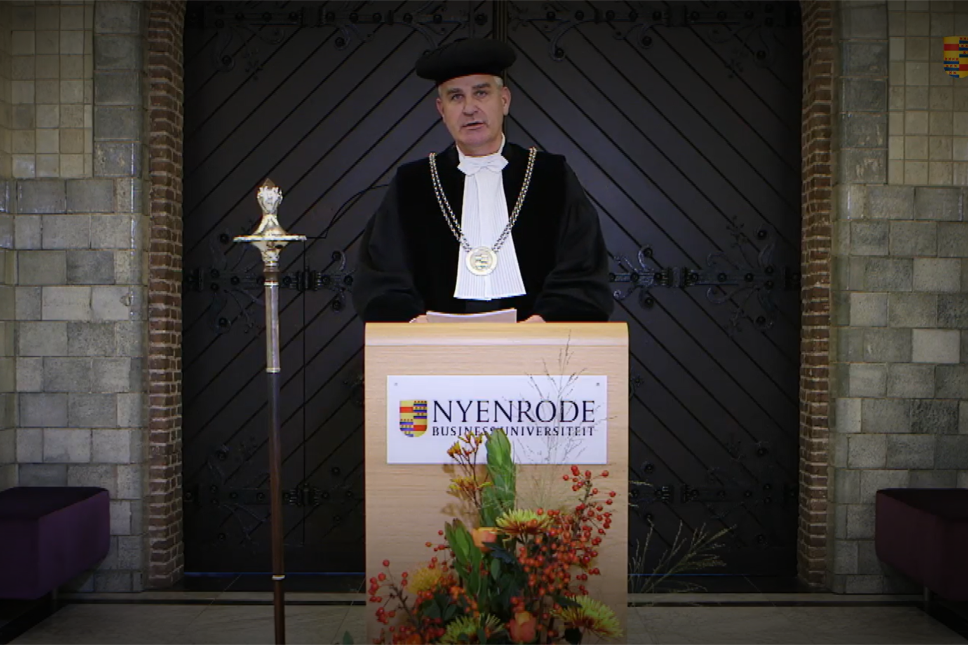 De nieuwe rector ging in zijn openingswoord in op de gevolgen van de coronacrisis en de door de Nyenrode community getoonde veerkracht. Hij sprak zijn waardering uit voor de transformatie die Nyenrode heeft gerealiseerd naar blended en online onderwijs. In het verlengde hiervan sprak hij ook over de strategie voor de komende jaren waarbij transformatie in onderzoek, onderwijs en maatschappelijke impact centraal staat. “Dit kan alleen succesvol gerealiseerd worden door de betrokkenheid van de gehele Nyenrode community. Naast faculty en staff rekenen we ook op de betrokkenheid van studenten, deelnemers en alumni. We hebben elkaar nodig de komende jaren”, aldus Becking.